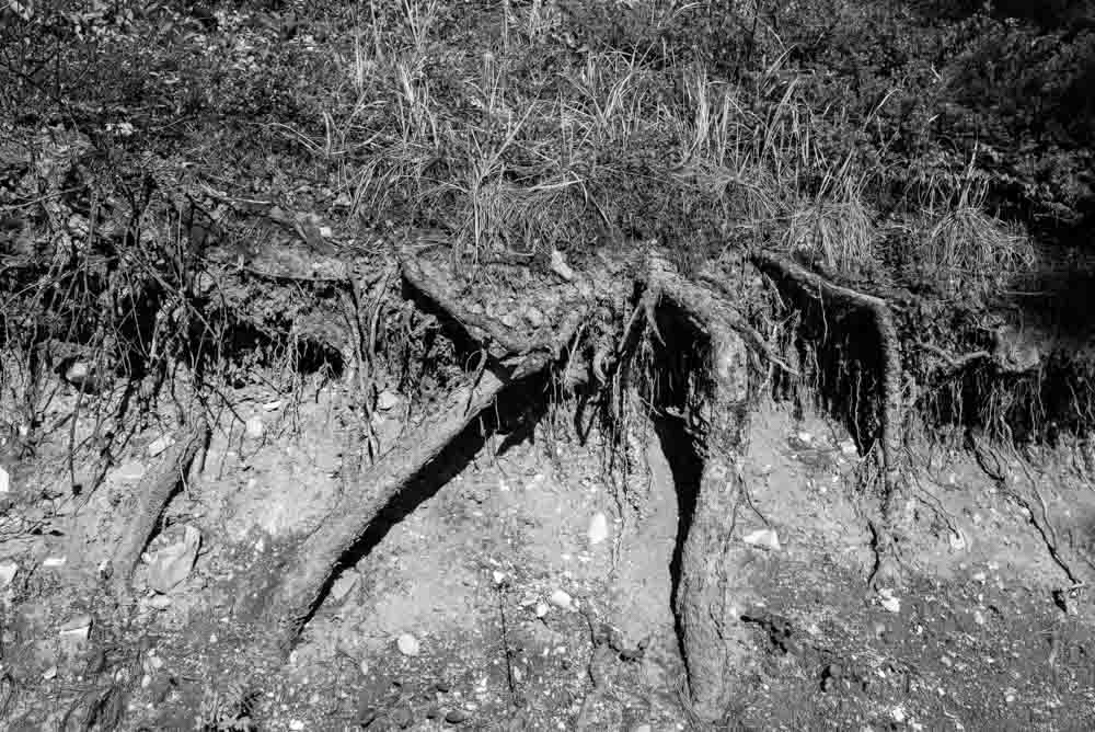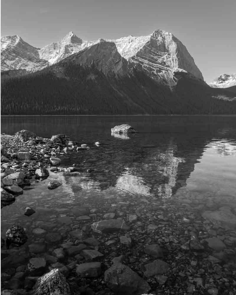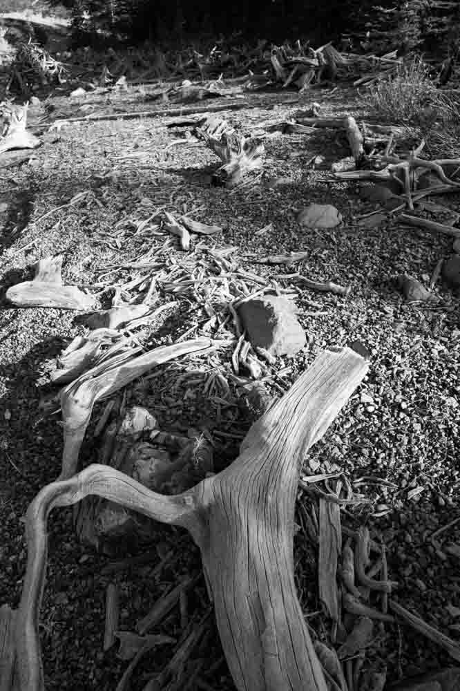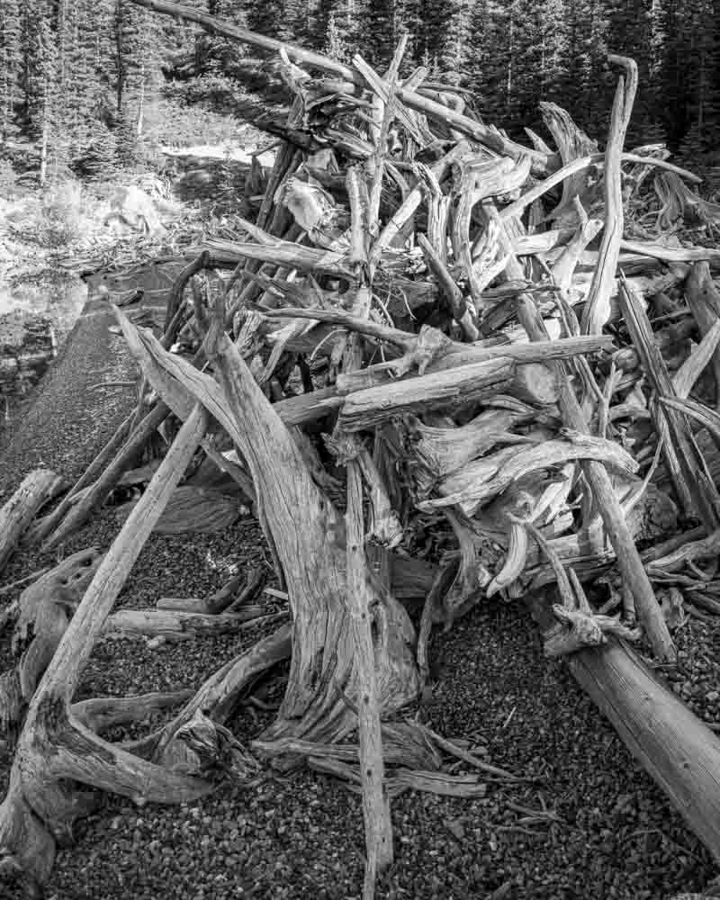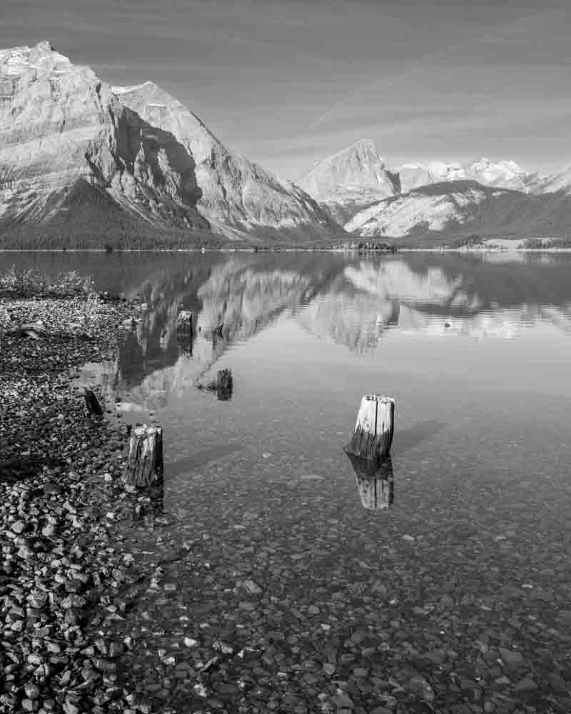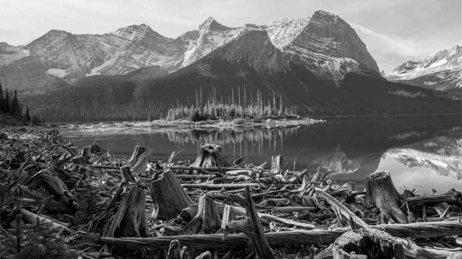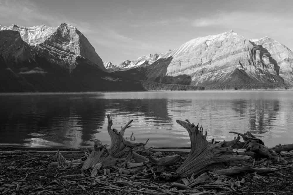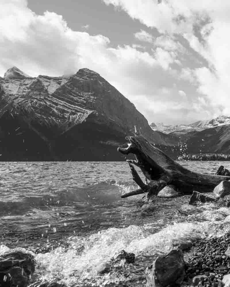 Interstitial. The small intervening spaces between things and objects. Spaces between places. It’s a fine word that describes the small physical locations between rocks, sediment, water and countless dead tree trunks along the shoreline of the Upper Kananaskis Lake in the Rocky Mountains of Alberta, Canada.