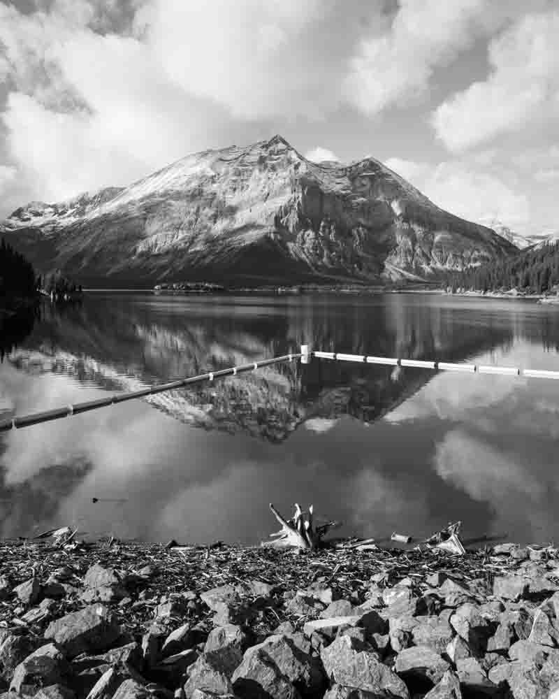 For many years, water from the reservoir was only used to augment the winter flow in the Bow River. It became a small hydroelectric dam in 1955 when the Interlakes Power Plant was completed by Calgary Power (now operated by Trans Alta). Most of the drawdown on the lake occurs between November and February, adding 5 MW of power to the Alberta grid. The water level is at its highest in October when these photographs were taken.