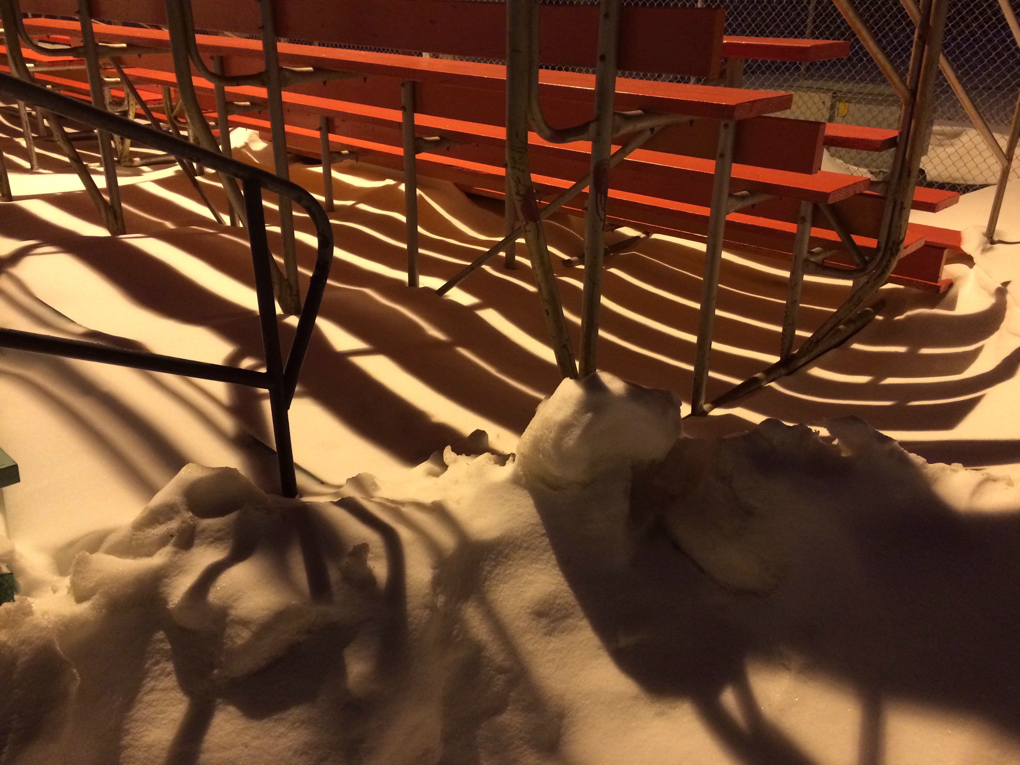 Driving into the Stu Peppard car park last night, my attention was drawn to temporary snow sculptures, deposits from the Zamboni cleaning the arena ice surface. Security lighting was illuminating them through the steps of the sports field bleachers, creating an “off-planet” look.