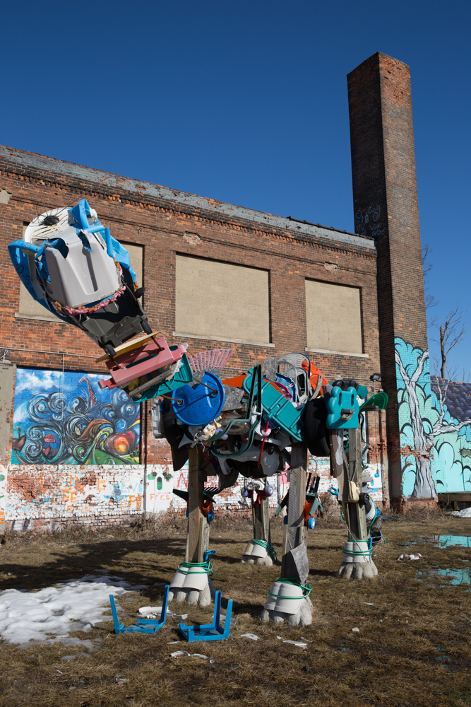 Frank the Dino watches over a small urban art park on Lincoln Street in Detroit. His roots go back, not into fossils but to a range of plastics eventually derived from those fossils, and metals; all recycled products that were found and gathered up during site cleaning. Years ago, the factory at his rear made Lincoln automobiles.
