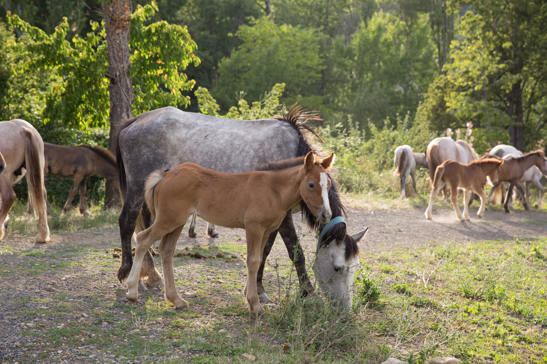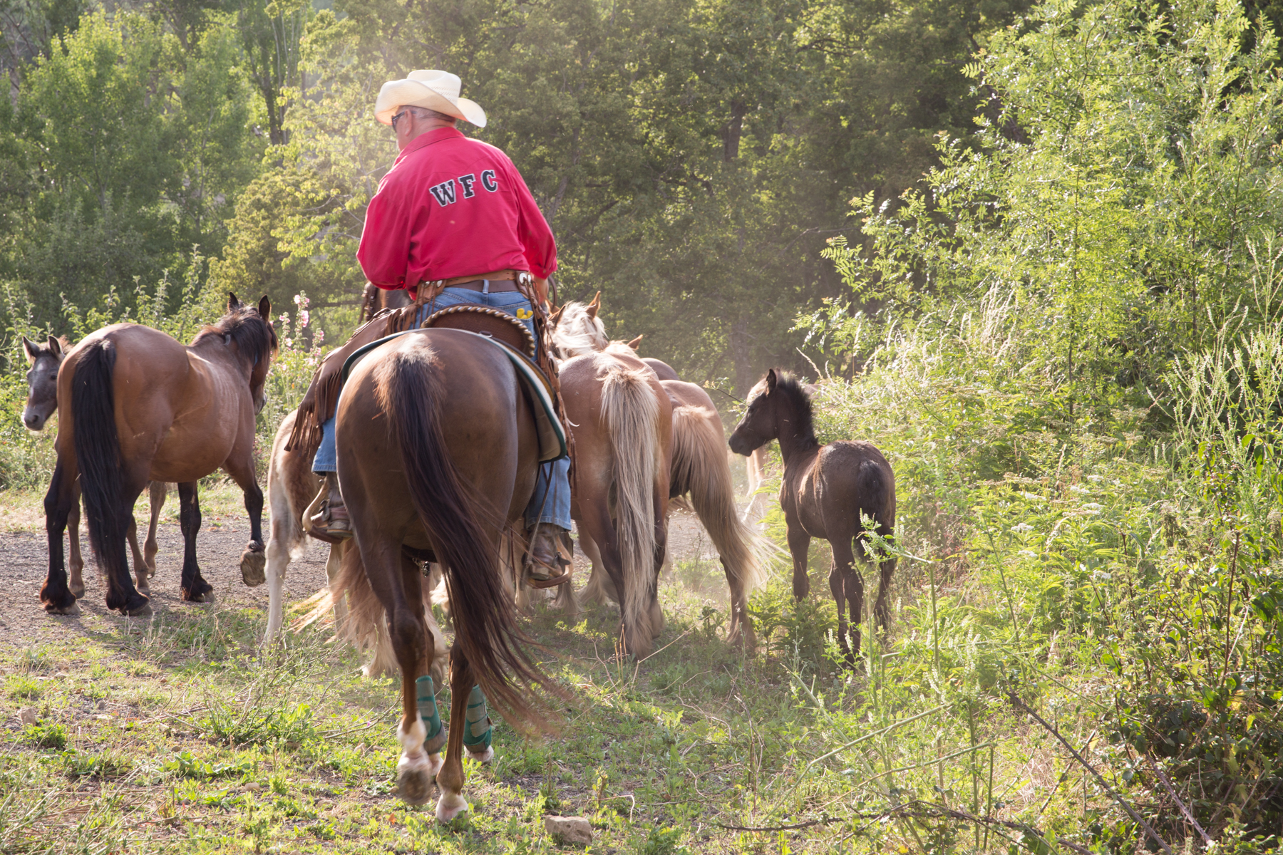 Stallions and mares accompanying foals appeared out of the trees. The herd had spent the spring and early summer higher up in the valley where it is cooler and less bothersome from flies. Down the track they went, steered by vaqueros (cowboys).