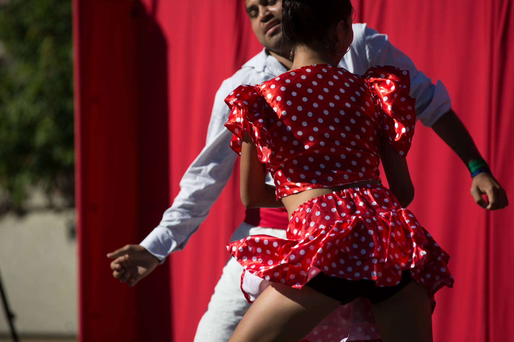 Dancers dressed in the national colours, red and white, performed in the rythmic Afro-Peruvian style of Festejo.