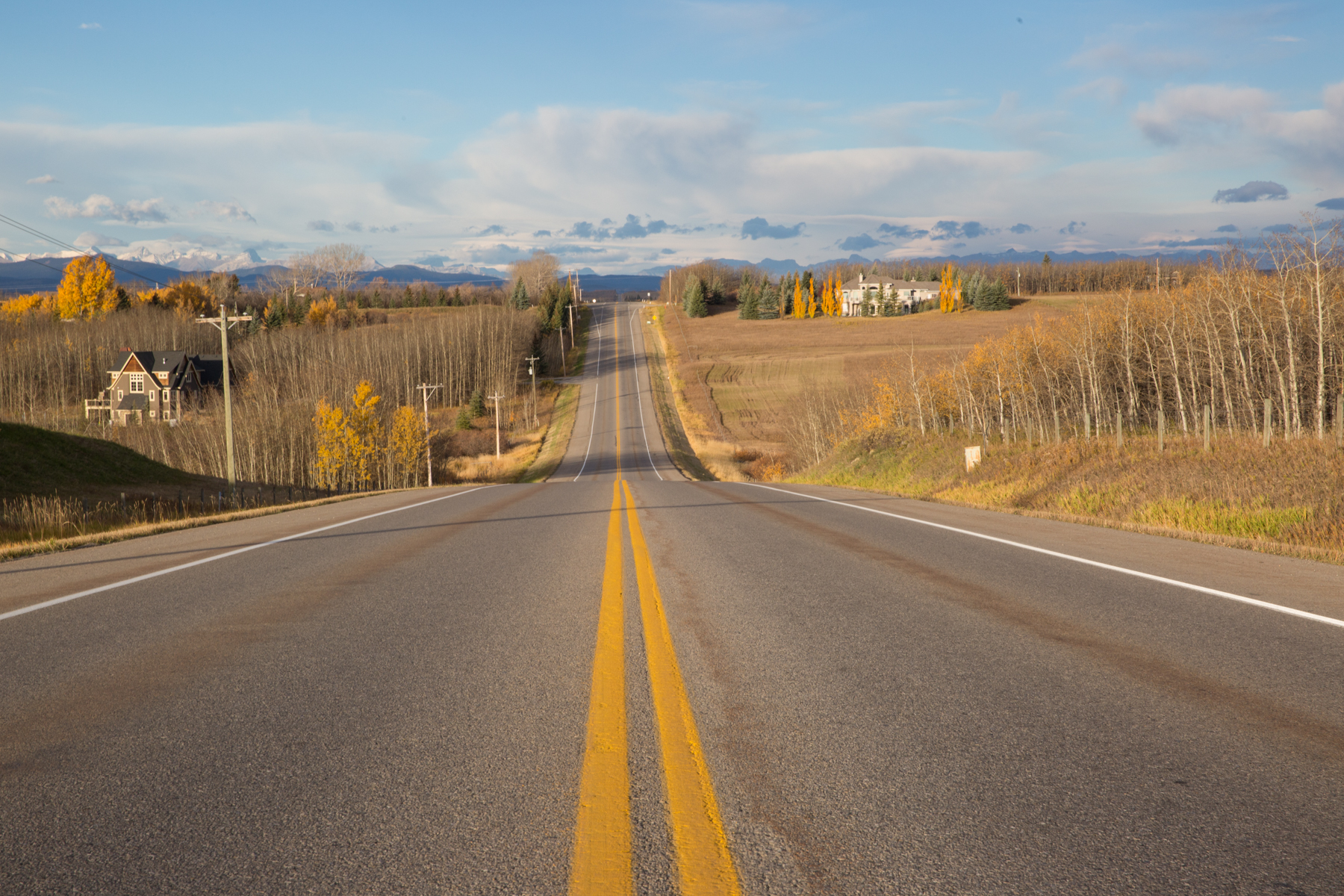 Yesterday was Canada’s Thanksgiving Day, the one that comes a month or so earlier than the American version. I headed out west from Calgary into Springbank for a photograph that came to mind the day before driving to the hockey arena. With so many motorists staying at home, I could safely sneak out and shoot from the middle of the road. Yellow lines down and over the hill towards yellowing birch and Swedish aspen and the Rocky Mountains.