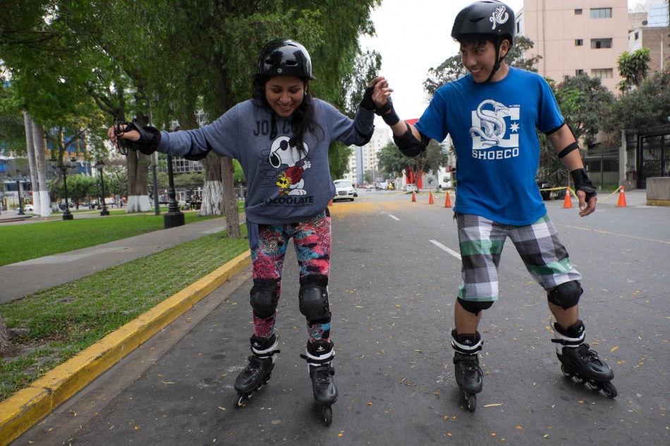 A young couple tries out in-line skating alongside Avenida Arequipa, Lima.