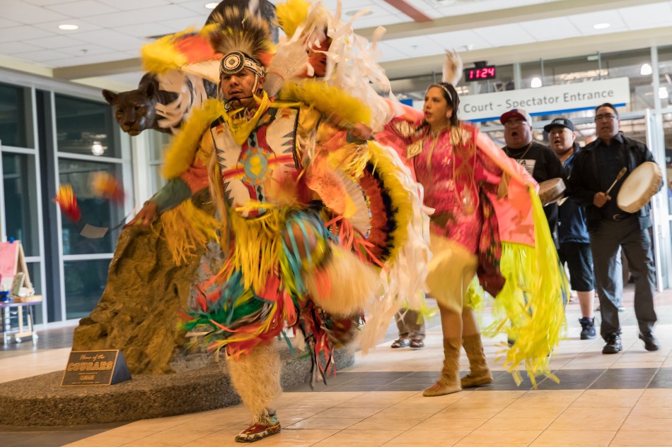 An estimated 1600 students congregated in the blue and white decked main gym, home of The Cougars, to receive encouragement and welcomes from senior staff members.  Frank Warner, the creator of PostSecret, an internet sensation that allows people to share, anonymously, secrets from their lives, gave an inspiring talk about how this release can change the way people act and how they can help each other when troubled. Drummers and dancers from the Niitsitapi- the Blackfoot First Nation, on whose traditional lands the Lincoln Park campus is located, led a parade of students through the corridors, lined up with many of the university staff enthusiastically cheering them along their first steps towards a degree in four years time.