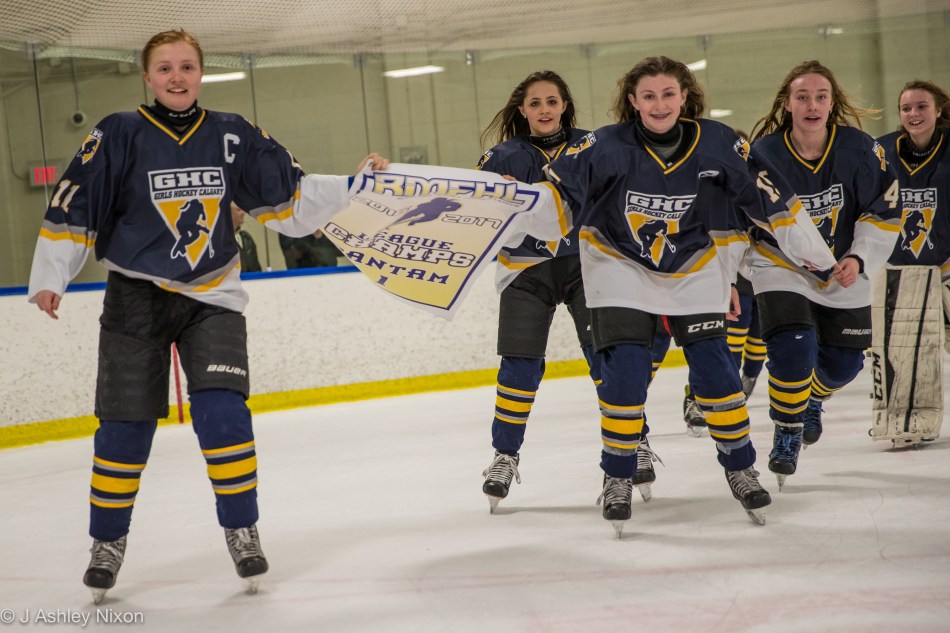 Girls Hockey Calgary (GHC) Silver took the Bantam 1 banner in the Rocky Mountain Female Hockey League last night at Ernie Starr Arena. In a closely fought three-game competition against their close GHC rivals, the White Hawks, they put in two unanswered goals to win the series, 2-1.