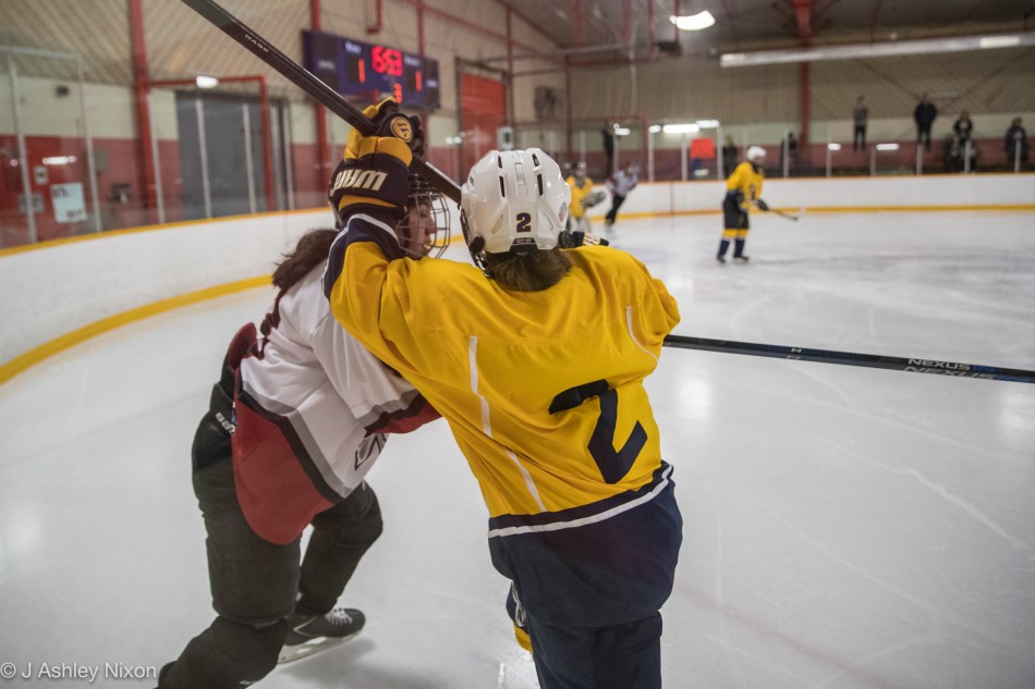 St. Albert took the lead in the first period with a goal by Aleena Taylor, her fourth in the tournament, assisted by Marissa Steinke. Calgary drew even in the second when Ella Kitchen put away her sixth goal of the weekend, assisted by Kayla Ironside and Chyenne Risling. The temperature was moving up towards 212 degrees in Castle Downs Arena on its last day of action before going into renovation for a couple of years. Both teams toughed it out during the final period, determined not to let a goal in. But the Blades put one in with 6′ 42″ on the clock, scored by Anika Neset. Some frantic moments with the goalie pulled were not enough for the Hawks and the score stayed that way: St. Albert Blades 2-1 Calgary White Hawks.