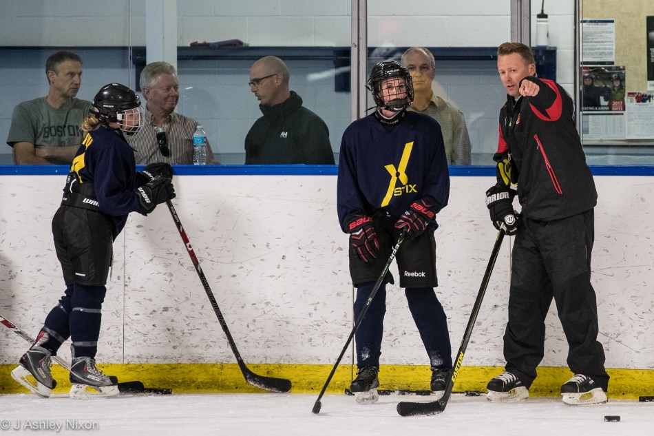 Glen Gulutzan (Head Coach, Calgary Flames) leads the STIX Hockey elite female hockey players through their practice at Norman Bush Arena, Calgary. Global Sport Academy CEO, Mark Maloney looks on.