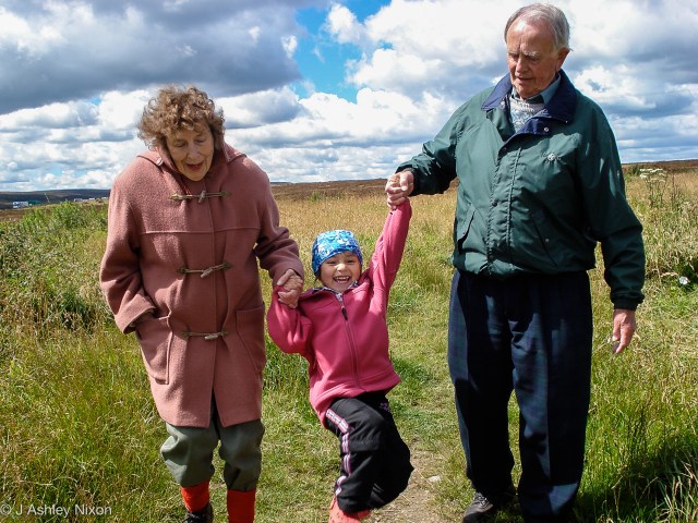 I was born and bred on these Haworth moors, a landscape made famous in Wuthering Heights by Emily Brontë. Fond memories of my Mum and Dad, seen here with their granddaughter, Jennifer.