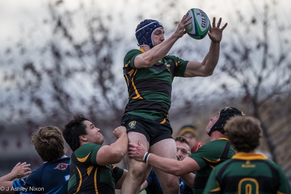 The temperature plunged from double digits to just a few degrees and cold enough to snow as the first round game of the Can West playoffs got underway at Lincoln Park, the home of Mount Royal University rugby. Facing their Springbok-like rivals, the University of Alberta (the resemblance is based on their green and gold jerseys), the game showed points just from the boot in the first half as the Edmonton-based university team took the lead, 6-0 from two penalties in front of the posts.