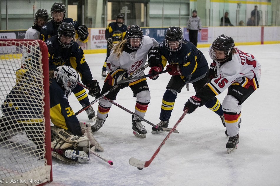 North Central Impact came close to tying up the score early in the second period when they went on the power play. A close up shot was banged in towards what looked like day light in the net but Ali Kieren snapped swiftly across her line to pad the puck away. A beautiful save that gave the Fire White a break and the foundation to secure their win. That came after 16 minutes into the second period when Ella Kitchen picked up a puck sent in to the net by Hailey Wiltshire. In the very next shift Wiltshire almost got a goal to add to her assist but the goalie got that one.
