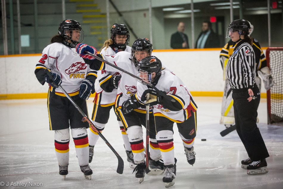 Calgary Fire White celebrate their second goal, scored by Hailey Wiltshire in the Alberta Female Hockey League (Bantam Elite) game versus Edmonton Pandas at Bill Hunter Arena, Edmonton, Canada.