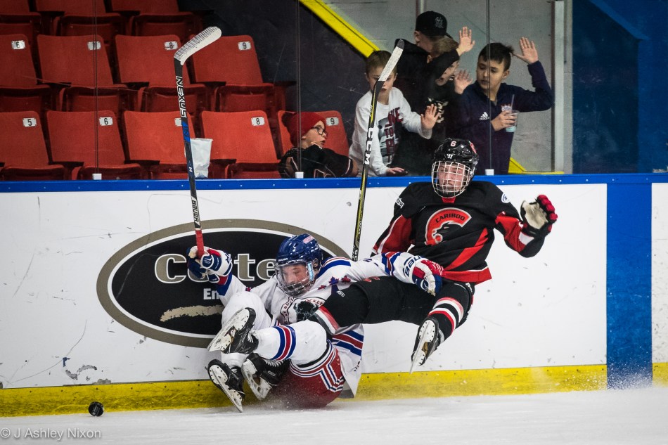 The Cariboo Cougars were thrifty with their shots but created a two-goal lead after twenty minutes. In contrast, the Calgary Buffaloes were going shot-gun, pummeling the Cougars goalie, Marcus Allan.