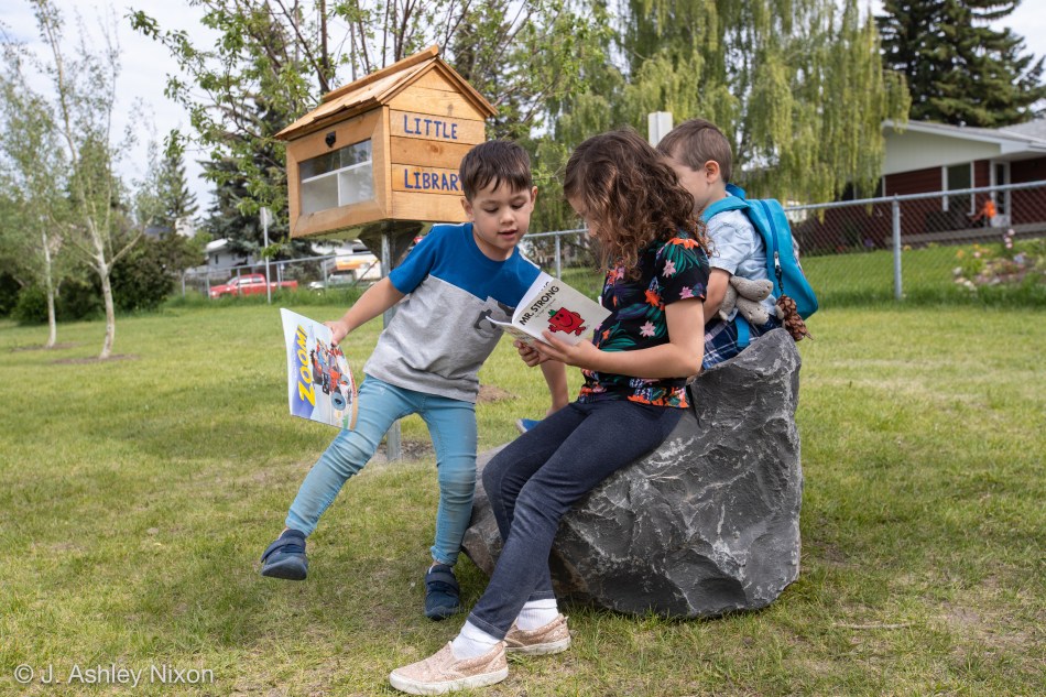 Children read books from the Little Library, part of the Reflection Grove dedicated to special members of the Connect Charter School community who have passed on.