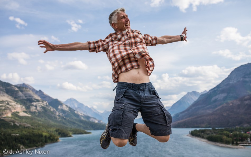 In August, my university friends, Peter and Dave came over from England for a visit with their wives, Suzanne and Nancy. It was a smashing reunion, involving a road trip over the Rockies to Osoyoos, a journey down to Waterton, where Peter Morris jumped over the lake (see featured image, above), a birthday party to remember out on our back deck, and the retake of a photograph I took decades ago when we were students living in the same house in Coventry.