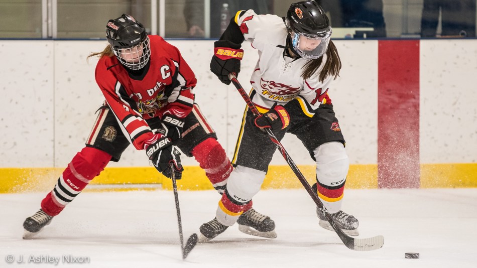 Zoe Lorenz-Boser, Red Deer Chiefs (in red) and Jennifer Nixon, Calgary Fire Red (in white) battle for the puck during their Alberta Female Hockey League (Midget Elite) game at Kinsmen Community Arenas, Red Deer on March 2, 2019. © J. Ashley Nixon