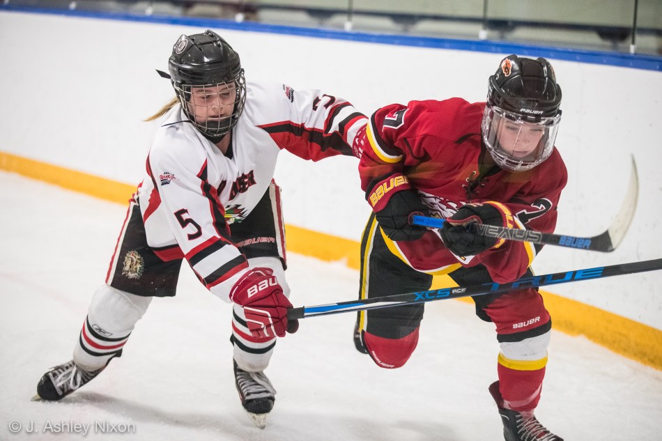 Sarah Gette, Red Deer Chiefs (in white) and Siobhan Sullivan, Calgary Fire Red compete for the puck during their Midget AA Alberta provincial playoff game at Rose Kohn Arena, Calgary on March 15, 2019. Photograph: J. Ashley Nixon.