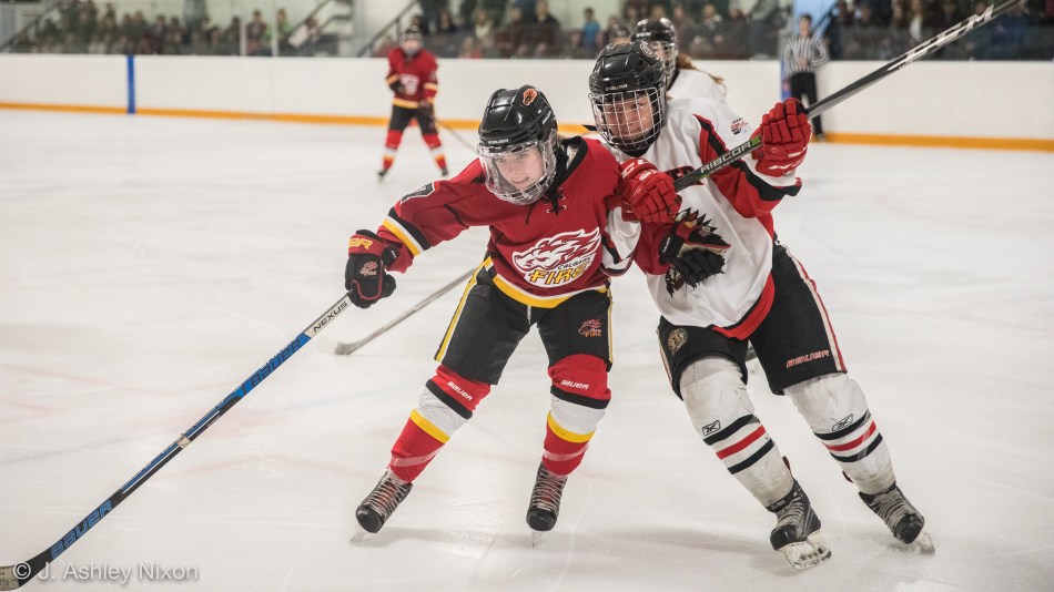 Siobhan Sullivan, Calgary Fire Red (in red) and Sidney Kobi, Red Deer Sutter Fund Chiefs in action during their Alberta Female Hockey League (Midget Elite) playoff game at Murray Copot Arena, Calgary on March 17, 2019. © J. Ashley Nixon
