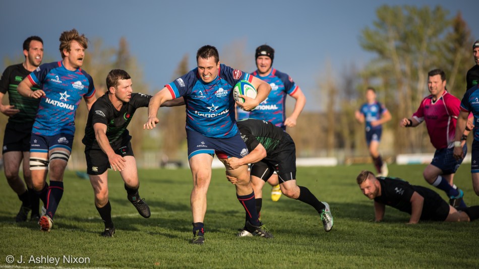 Gabe Kajdy scores his second of four tries for the Calgary Canucks in their Alberta Cup game against Saracens at Calgary Rugby Park on May 24, 2019. © J. Ashley Nixon