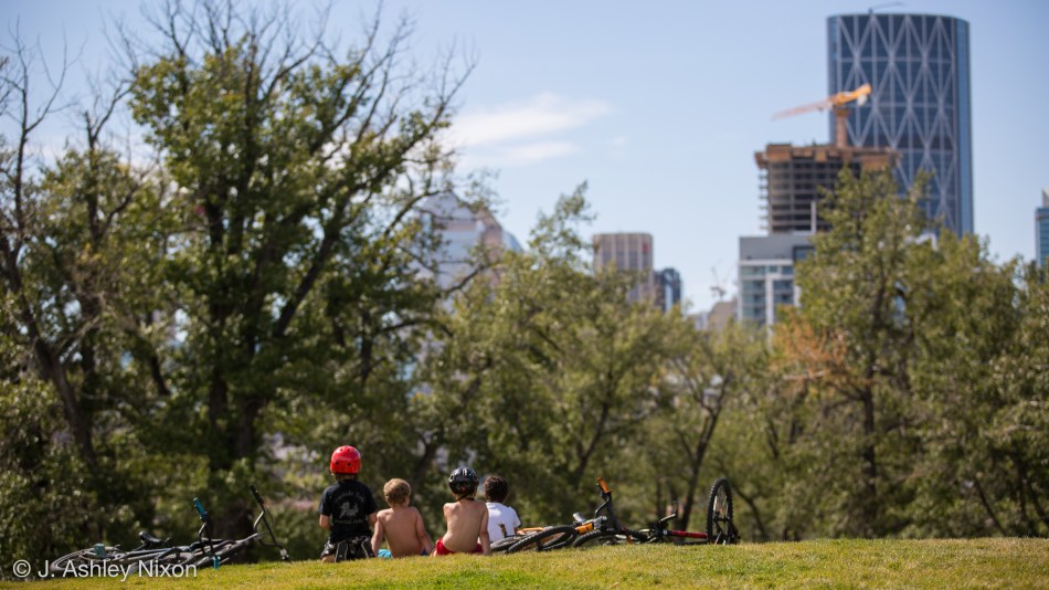 Young cyclists take in the view of downtown Calgary from Patrick Island on the Bow River. © J. Ashley Nixon