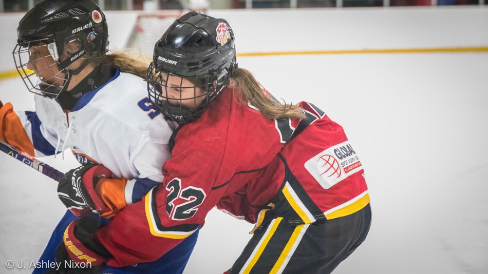 Hannah Suto, Calgary Fire White (playing in red) and a Southern Express player compete for the puck in their Alberta Female Midget Elite game at Bowness Sportsplex, Calgary, Alberta, November 16, 2019. © J. Ashley Nixon