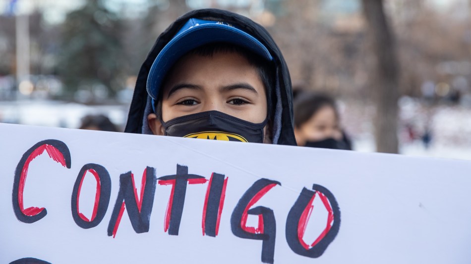 Familias peruanas se manifiestan en solidaridad con sus compatriotas/Peruvian families demonstrate in solidarity with their compatriots. Olympic Plaza, Calgary, Alberta, Canada 2020-11-15. © J. Ashley Nixon