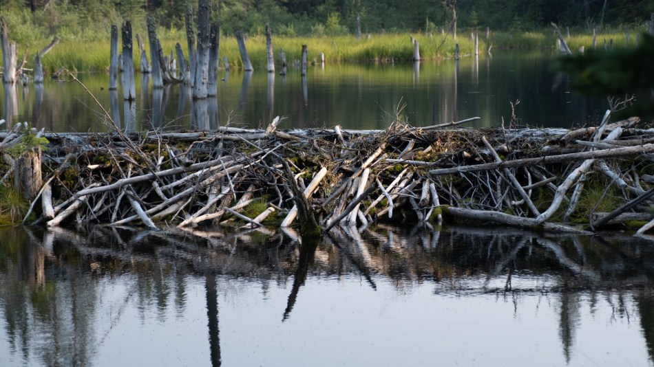 Beaver dams stretch, on average, for about 32m across streams to store and slow down flowing water. Lotic (riverine) ecosystems turn into lentic (lacustrine) ecosystems. This benefits beavers as they can build a more stable lodge with a secure underwater entrance to raise their kits and store food over winter. Unlike otters, beavers do not eat fish. They live off trees (aspen and willow are their favourites in Canada), thanks to their gut microbial flora that help them digest cellulose. This constructed environmental change has other ecological benefits such as increased biodiversity and socio-economic benefits for flood mitigation and climate change adaptation.