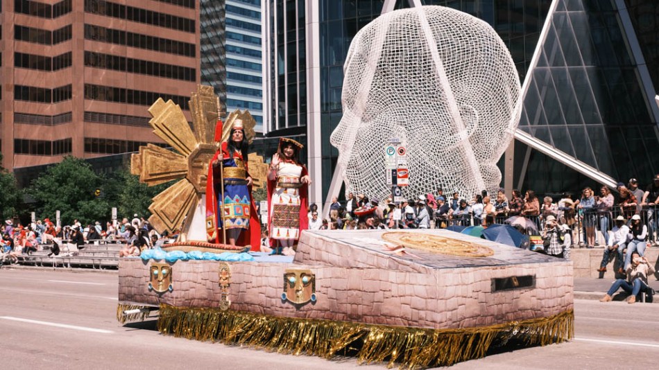 In the header photo (above), Manco Capac and Mama Ocllo are standing on the Raíces del Perú float as it passes the Bow Building and Wonderland (2012), one of Jaume Plensa’s wonderful sculptures that Calgary has the privilege to show.