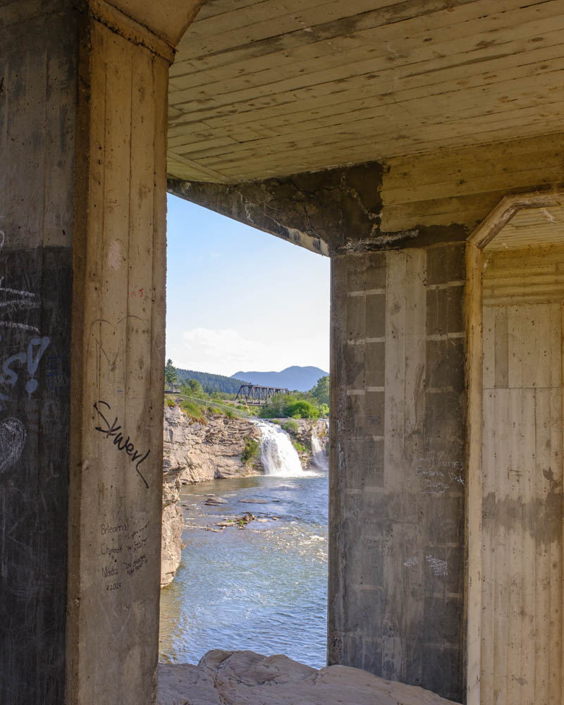 In the evening, I walked back along the south bank of the Crowsnest River. The graffiti-daubed columns of the road bridge framed the falls. Below, besides the gathering deep pools, sat sunbathers. Children navigated inflatable animals into the gentle current, and anglers cast their lines into riffles for trout.