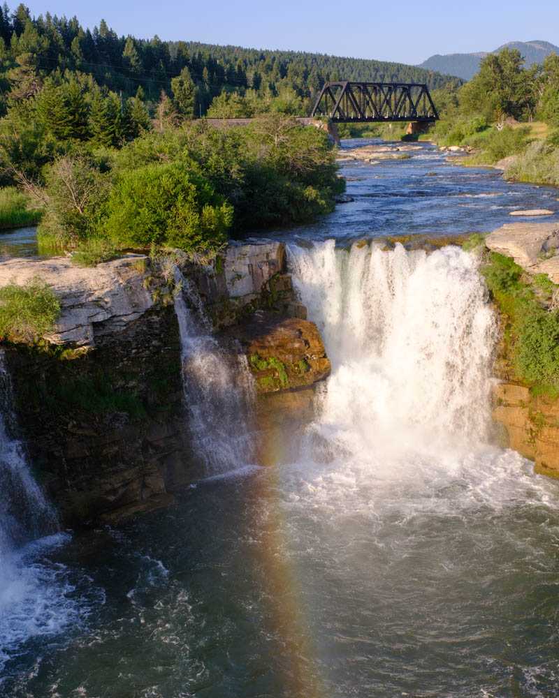 I returned to explore the view again with Aspen the Airedale early the following day. The rising sun behind me cast deep shadows onto the rocks and water. There were no people. Sadly, there were no trains, but a rainbow shimmered through the spray.
