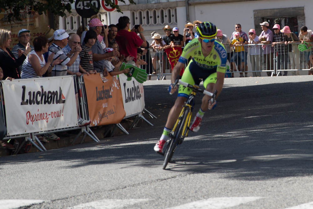 The next day, Le Tour started back down the valley at Saint-Gaudens. Stage 17 may have been the shortest distance in the 21 days (124.5 km), but it was heavily punctuated with four monster climbs, finishing at the ski resort above Saint-Lary-Soulan. We got out on the street early again, this time in Saint Mamet on a corner facing up towards the Col de Portillon. We knew the riders would be screaming down from there after a short visit to Spain, and this corner would slow things down just a little. The bikes were through in a matter of seconds, heading on to Luchon before rising again to Col de Pyresourde and then Saint-Lary Pla d’Adet. Polka Dot-clad Rafal Majka made an impressive attack on the final slopes to claim the stage, the second in two days in the mountains for team Tinkoff Saxo.