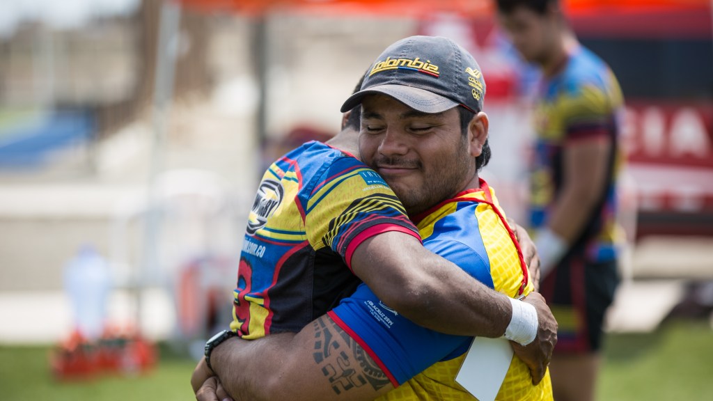 Colombia, campeones del torneo de rugby Sudamericano M18, 2016. Chiclayo, Peru. William León celebra con uno de sus jugadores. ©Continue Reading
