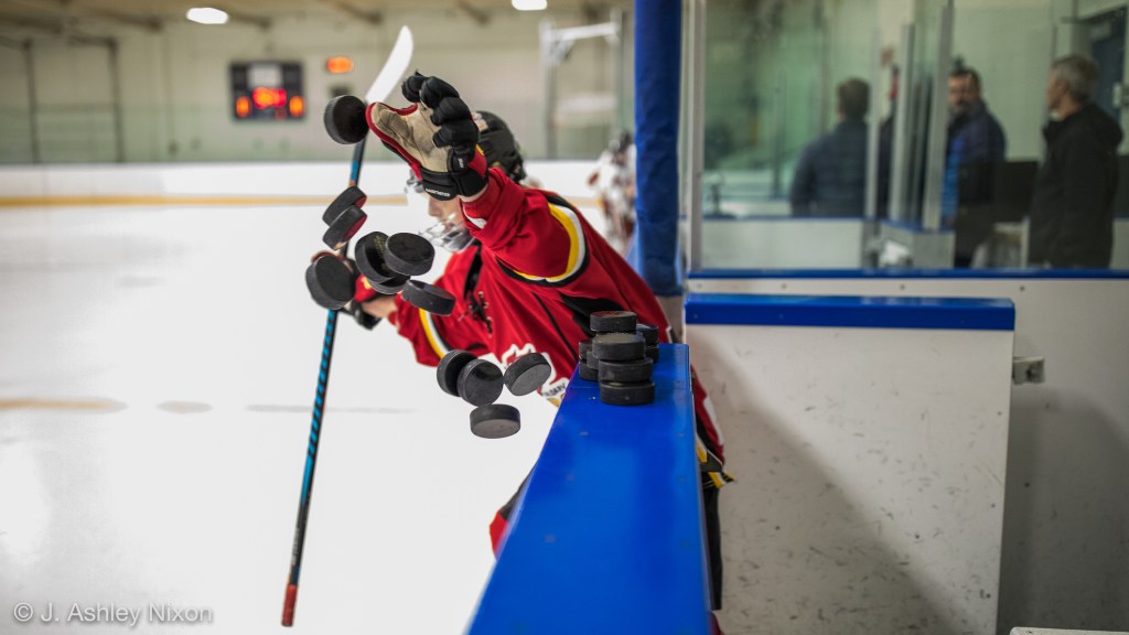 Kelly Stanford knocks over the pucks to get the game going between Calgary Fire Red and Red Deer Sutter FundContinue Reading